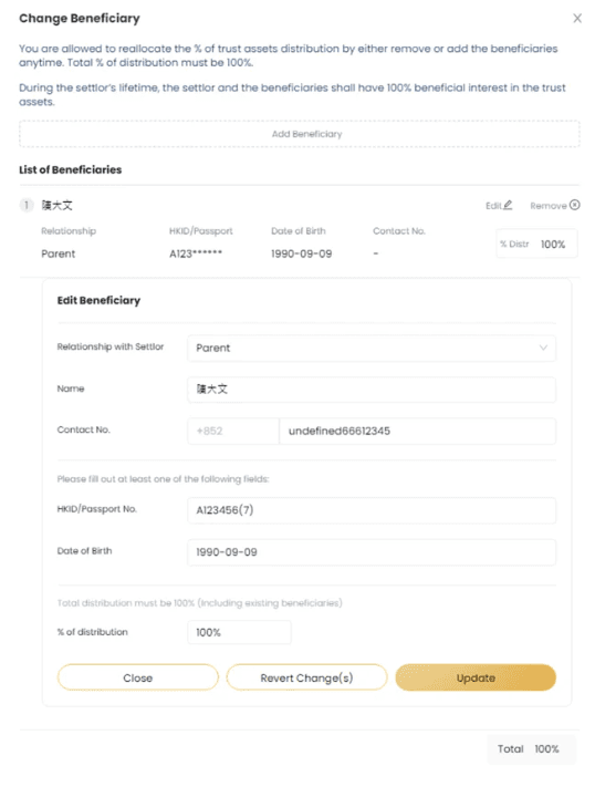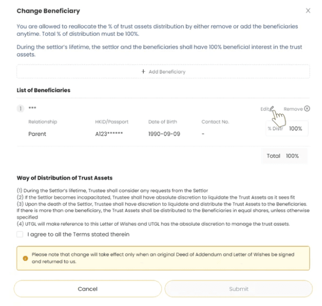 Click "Add Beneficiary" and the Beneficiary(1) field will appear. You can fill in the beneficiary information here, the total percentage of distribution must be 100, check the box "Agree to all terms and conditions stated therein", and then click “Submit”.