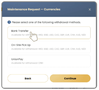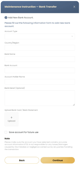 Fill your bank account information and write down any bank details of your account, such as the branch code. Press ‘Confirm’ to proceed. When the instruction is successfully sent, the system will record your bank information.