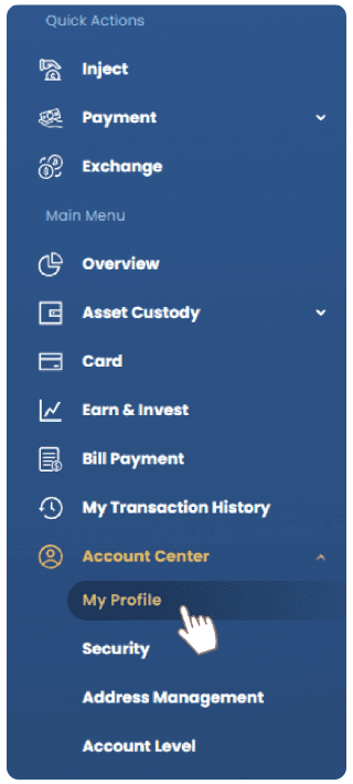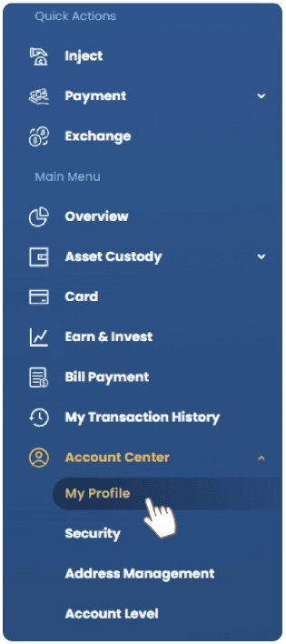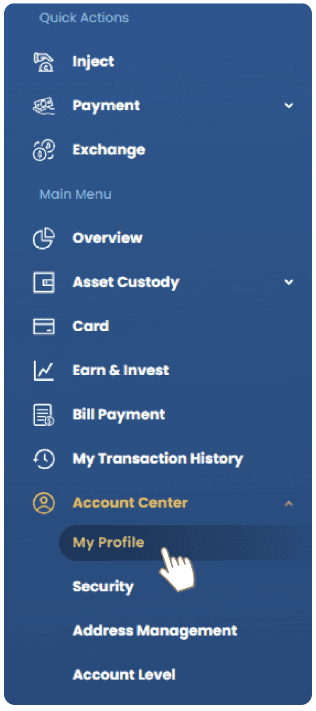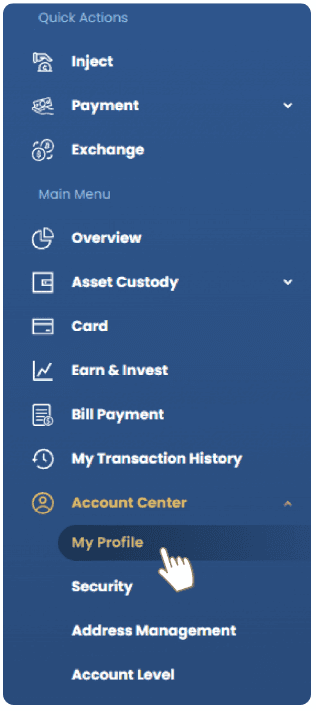 After log in the account, select “Account Center” > “ My Profile” on the left menu.