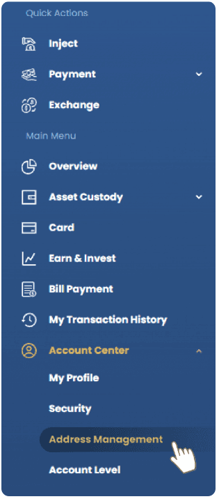 After log in the account, select “Account Center” > “Address Management” on the left menu.