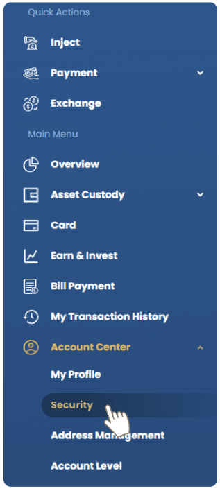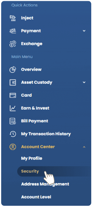 After log in the account, select “Account Center” > “Security” on the left menu.
