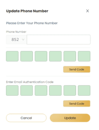 Enter the new phone number and click ‘Send Code’ to receive a verification code on your phone and Google 2FA Authentication Token. Then, click ‘Update’.The Phone No. will be updated.