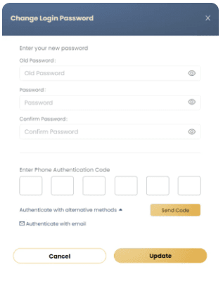 Type the new password twice and enter the Authentication Code, then click “Update”. Besides authenticating with sms, you can expand “Authenticate with alternative methods” and select authenticate with email.