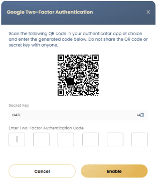 A 6 digits code will be shown in the app on your phone. Enter this on the platform, then click ‘Enable’.
