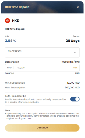 Please select the account and enter the subscription amount, if you want to Auto-Resubscribe, you can turn on the Auto-Resubscribe function and then click “Continue”。